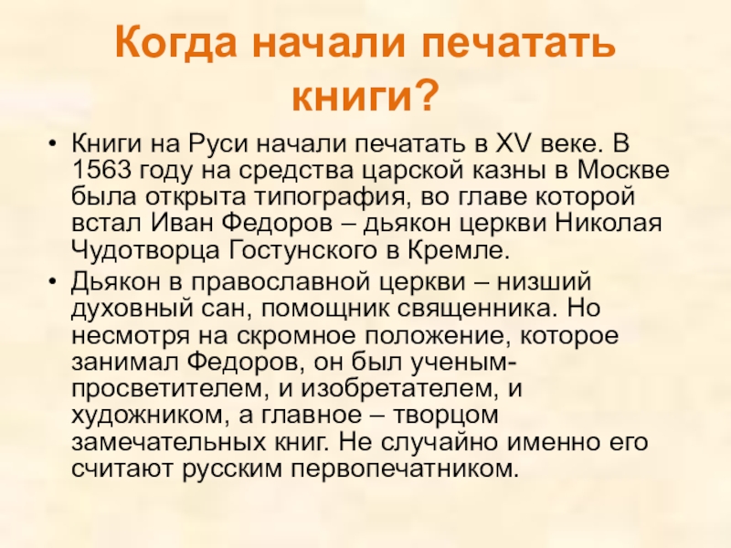 Дьякон в православной церкви – низший духовный сан, помощник священника. Но несмотря на скромное положение, которое занимал Федоров, он был ученым-просветителем, и изобретателем, и художником, а главное – творцом замечательных книг. Не случайно именно его считают русским первопечатником.