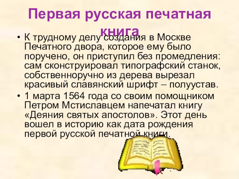 1 марта 1564 года со своим помощником Петром Мстиславцем напечатал книгу «Деяния святых апостолов». Этот день вошел в историю как дата рождения первой русской печатной книги.
