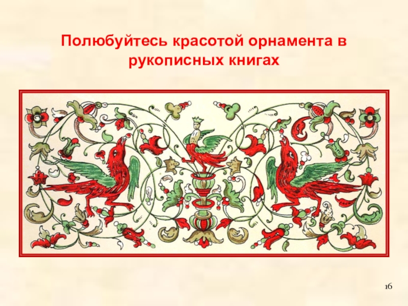 Слайд 16Полюбуйтесь красотой орнамента в рукописных книгах