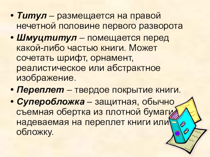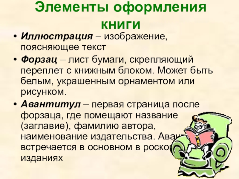 Но особенно велика роль творчества художника, когда он выполняет внешние элементы оформления книги (суперобложку, переплет или обложку), форзац и различные элементы оформления внутри книги (авантитул, титульный лист, шмуцтитулы, иллюстрации).