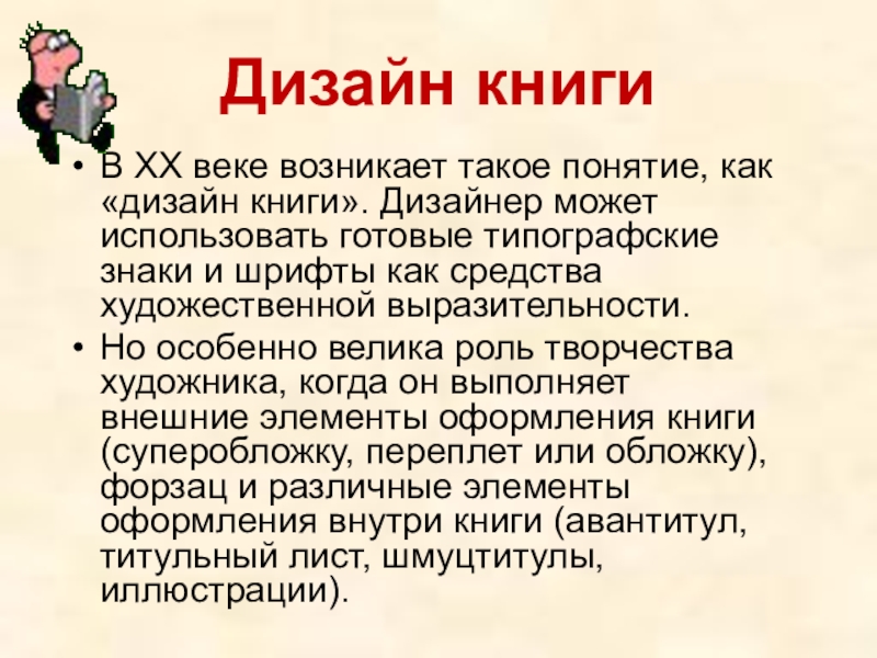 В XX веке возникает такое понятие, как «дизайн книги». Дизайнер