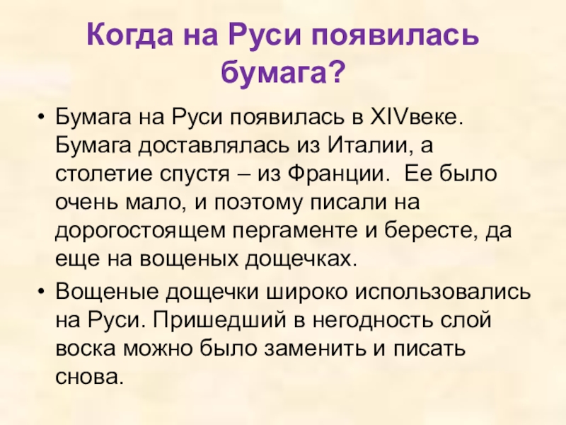 доставлялась из Италии, а столетие спустя – из Франции. Ее было очень мало, и поэтому писали на дорогостоящем пергаменте и бересте, да еще на вощеных дощечках.