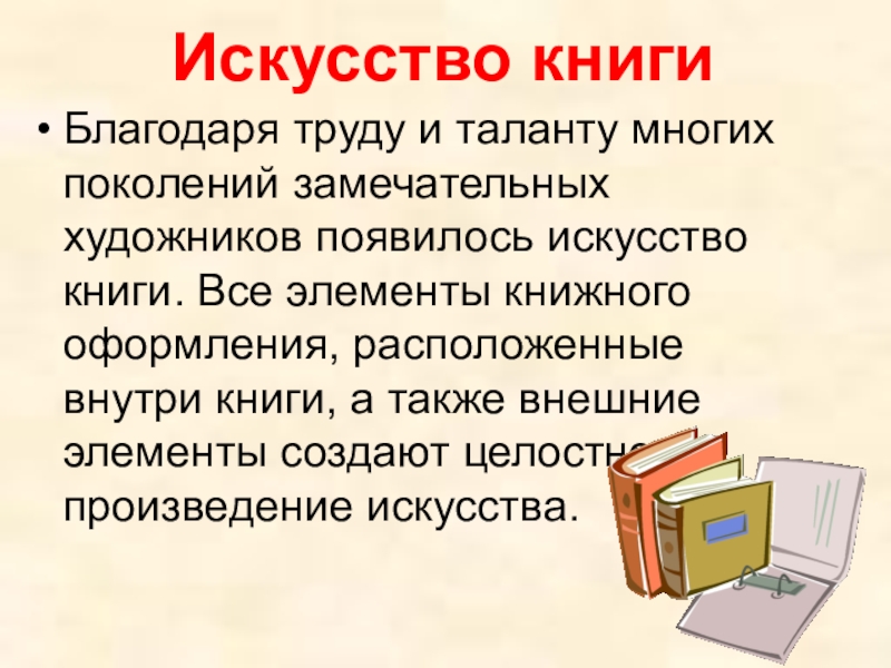 книги. Все элементы книжного оформления, расположенные внутри книги, а также внешние элементы создают целостное произведение искусства.
