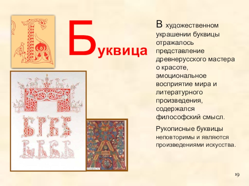 Слайд 19В художественном украшении буквицы отражалось представление древнерусского мастера о красоте, эмоциональное