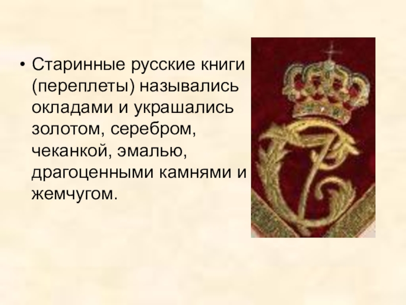 Старинные русские книги (переплеты) назывались окладами и украшались золотом, серебром, чеканкой,