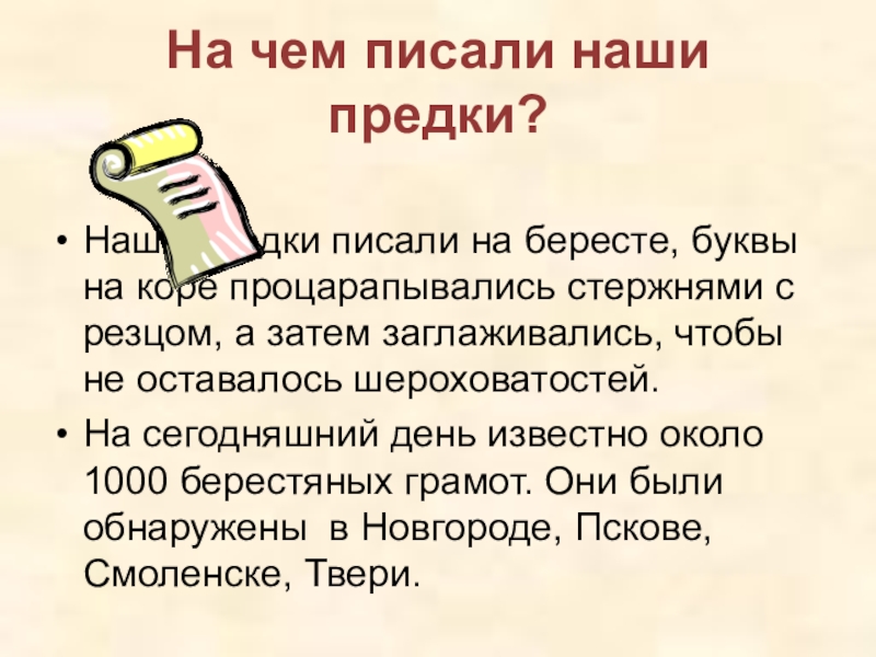 На сегодняшний день известно около 1000 берестяных грамот. Они были обнаружены в Новгороде, Пскове, Смоленске, Твери.