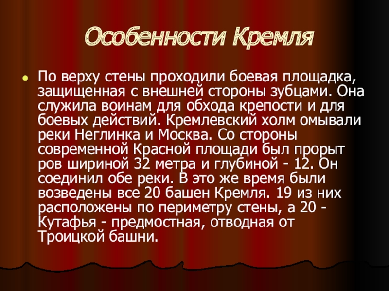 зубцами. Она служила воинам для обхода крепости и для боевых действий. Кремлевский холм омывали реки Неглинка и Москва. Со стороны современной Красной площади был прорыт ров шириной 32 метра и глубиной - 12. Он соединил обе реки. В это же время были возведены все 20 башен Кремля. 19 из них расположены по периметру стены, а 20 - Кутафья - предмостная, отводная от Троицкой башни.