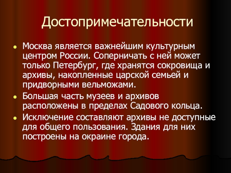 Москва является важнейшим культурным центром России. Соперничать с ней может только