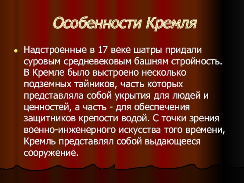 В Кремле было выстроено несколько подземных тайников, часть которых представляла собой укрытия для людей и ценностей, а часть - для обеспечения защитников крепости водой. С точки зрения военно-инженерного искусства того времени, Кремль представлял собой выдающееся сооружение.
