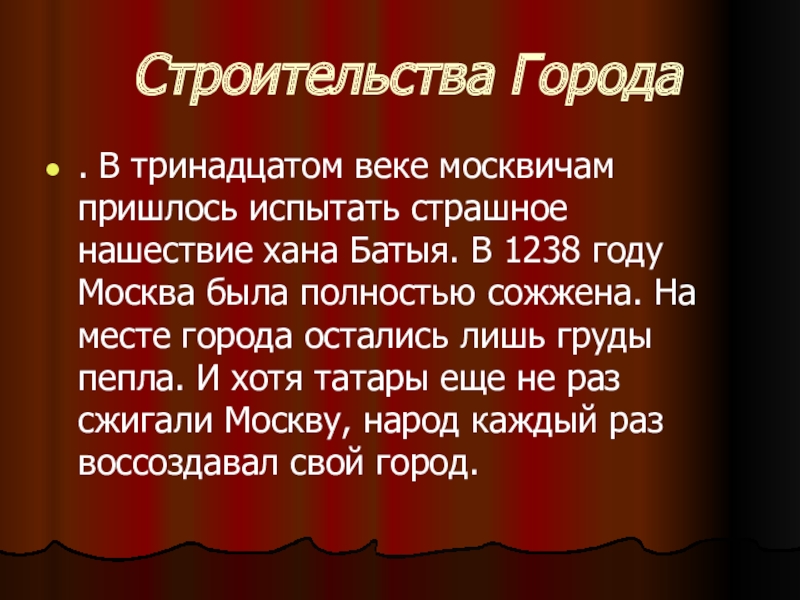 Батыя. В 1238 году Москва была полностью сожжена. На месте города остались лишь груды пепла. И хотя татары еще не раз сжигали Москву, народ каждый раз воссоздавал свой город.