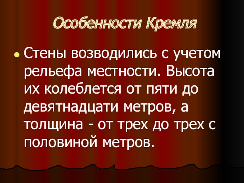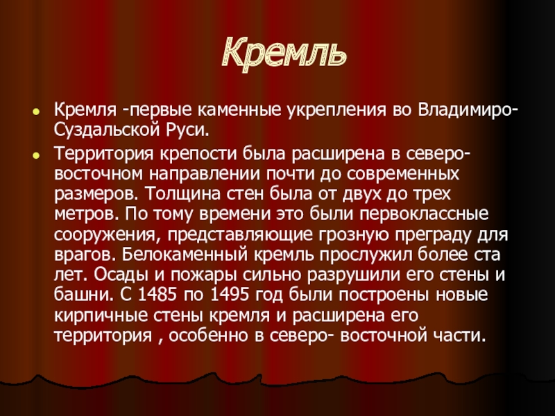 северо-восточном направлении почти до современных размеров. Толщина стен была от двух до трех метров. По тому времени это были первоклассные сооружения, представляющие грозную преграду для врагов. Белокаменный кремль прослужил более ста лет. Осады и пожары сильно разрушили его стены и башни. С 1485 по 1495 год были построены новые кирпичные стены кремля и расширена его территория , особенно в северо- восточной части.