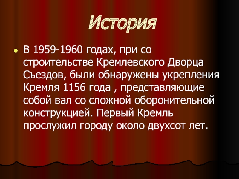 укрепления Кремля 1156 года , представляющие собой вал со сложной оборонительной конструкцией. Первый Кремль прослужил городу около двухсот лет.