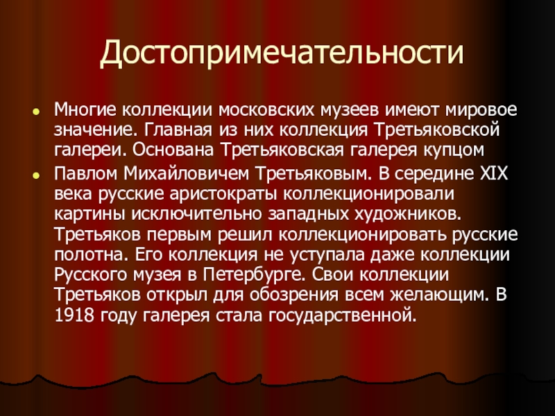 Павлом Михайловичем Третьяковым. В середине XIX века русские аристократы коллекционировали картины исключительно западных художников. Третьяков первым решил коллекционировать русские полотна. Его коллекция не уступала даже коллекции Русского музея в Петербурге. Свои коллекции Третьяков открыл для обозрения всем желающим. В 1918 году галерея стала государственной.