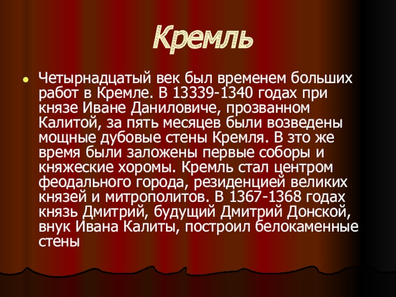 при князе Иване Даниловиче, прозванном Калитой, за пять месяцев были возведены мощные дубовые стены Кремля. В зто же время были заложены первые соборы и княжеские хоромы. Кремль стал центром феодального города, резиденцией великих князей и митрополитов. В 1367-1368 годах князь Дмитрий, будущий Дмитрий Донской, внук Ивана Калиты, построил белокаменные стены