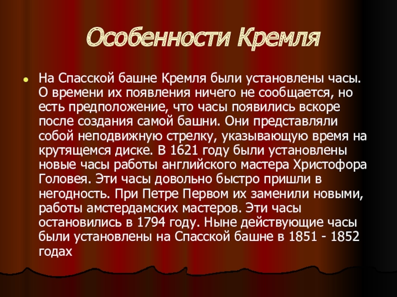 появления ничего не сообщается, но есть предположение, что часы появились вскоре после создания самой башни. Они представляли собой неподвижную стрелку, указывающую время на крутящемся диске. В 1621 году были установлены новые часы работы английского мастера Христофора Головея. Эти часы довольно быстро пришли в негодность. При Петре Первом их заменили новыми, работы амстердамских мастеров. Эти часы остановились в 1794 году. Ныне действующие часы были установлены на Спасской башне в 1851 - 1852 годах