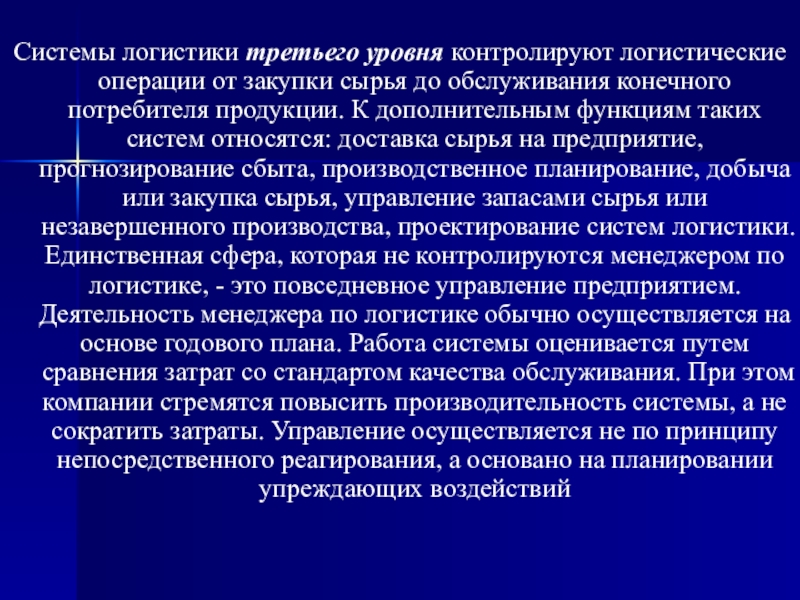 Слайд 11Системы логистики третьего уровня контролируют логистические операции от закупки сырья до