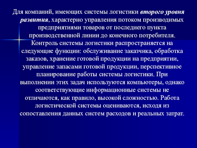 Слайд 10Для компаний, имеющих системы логистики второго уровня развития, характерно управления потоком