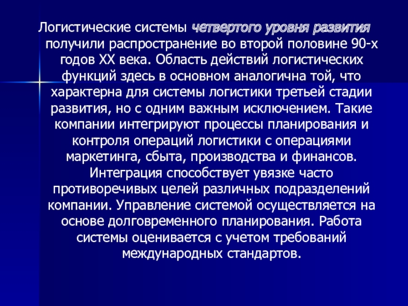 годов XX века. Область действий логистических функций здесь в основном аналогична той, что характерна для системы логистики третьей стадии развития, но с одним важным исключением. Такие компании интегрируют процессы планирования и контроля операций логистики с операциями маркетинга, сбыта, производства и финансов. Интеграция способствует увязке часто противоречивых целей различных подразделений компании. Управление системой осуществляется на основе долговременного планирования. Работа системы оценивается с учетом требований международных стандартов.