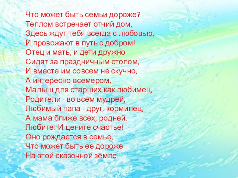 Что может быть семьи дороже?Теплом встречает отчий дом,Здесь ждут тебя всегда с любовью,И провожают в путь с добром!Отец и мать, и дети дружноСидят за праздничным столом,И вместе им совсем не скучно,А интересно всемером,Малыш для старших как