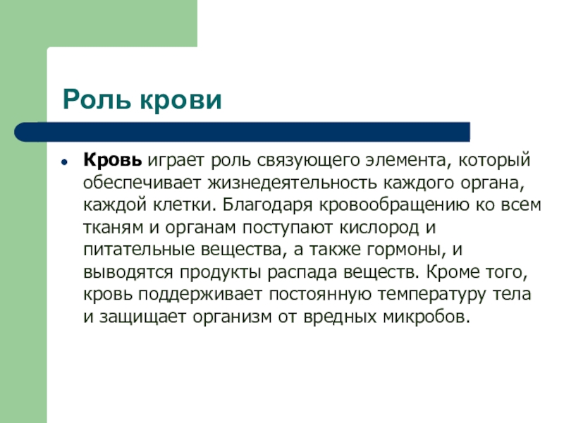 Роль кровиКровь играет роль связующего элемента, который обеспечивает жизнедеятельность каждого органа, каждой клетки. Благодаря кровообращению ко всем