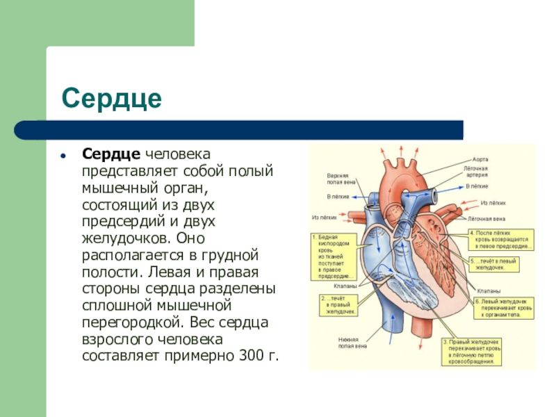 и двух желудочков. Оно располагается в грудной полости. Левая и правая стороны сердца разделены сплошной мышечной перегородкой. Вес сердца взрослого человека составляет примерно 300 г.