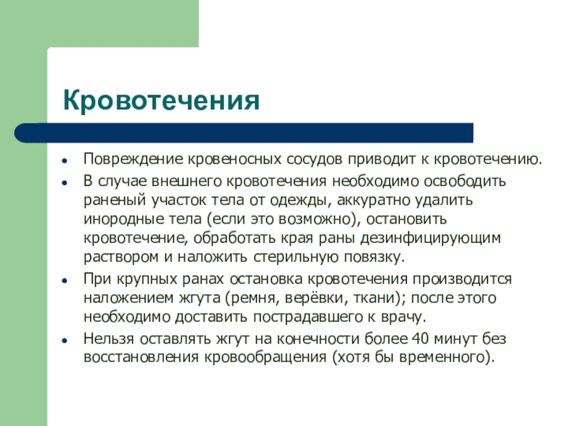 КровотеченияПовреждение кровеносных сосудов приводит к кровотечению.В случае внешнего кровотечения необходимо освободить раненый участок тела от одежды, аккуратно