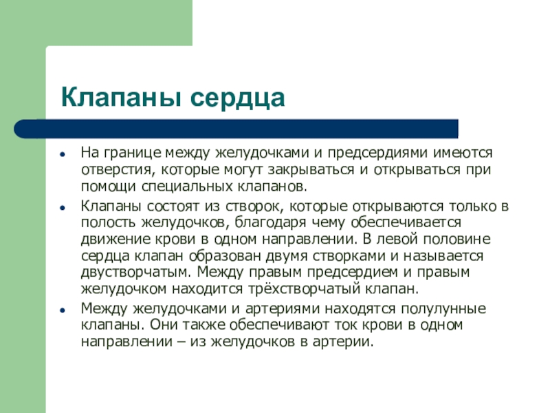 Клапаны состоят из створок, которые открываются только в полость желудочков, благодаря чему обеспечивается движение крови в одном направлении. В левой половине сердца клапан образован двумя створками и называется двустворчатым. Между правым предсердием и правым желудочком находится трёхстворчатый клапан.