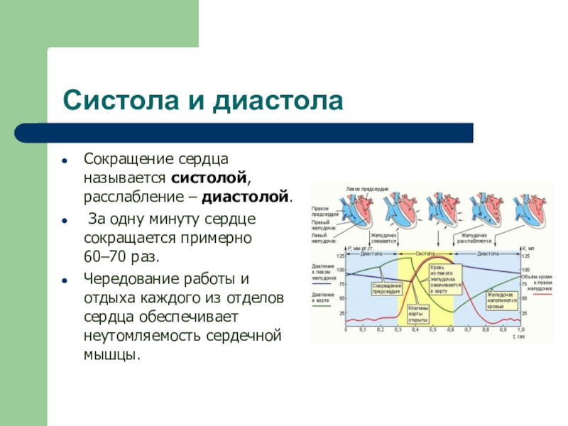Систола и диастолаСокращение сердца называется систолой, расслабление – диастолой. За одну минуту сердце сокращается примерно 60–70 раз.