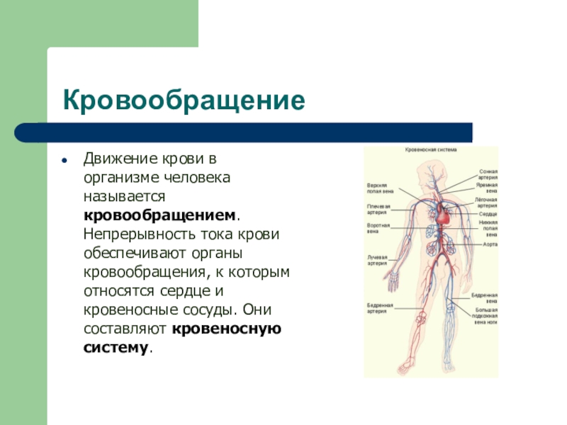 Движение крови в организме человека называется кровообращением. Непрерывность тока крови обеспечивают