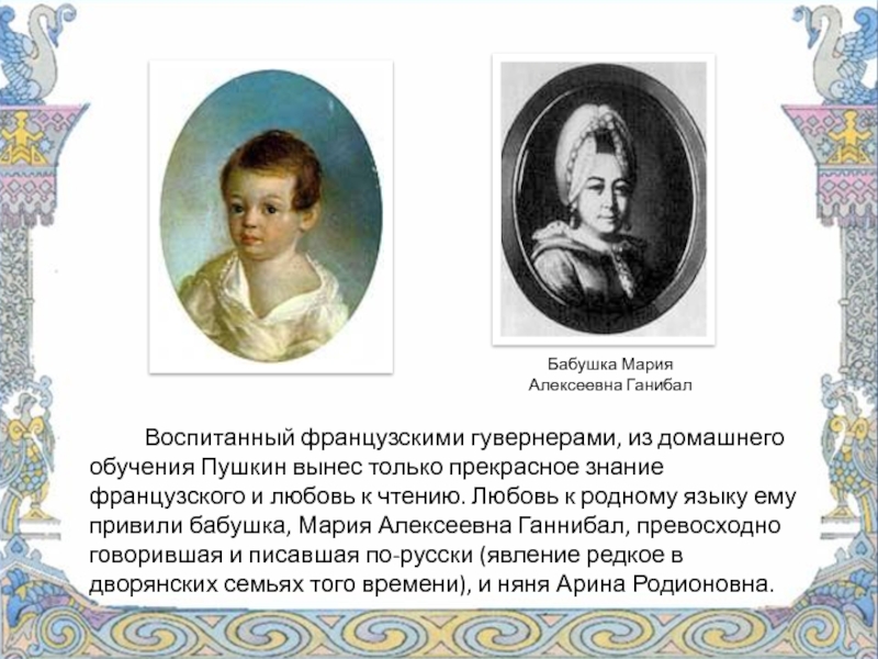 Любовь к родному языку ему привили бабушка, Мария Алексеевна Ганнибал и няня Арина Родионовна.