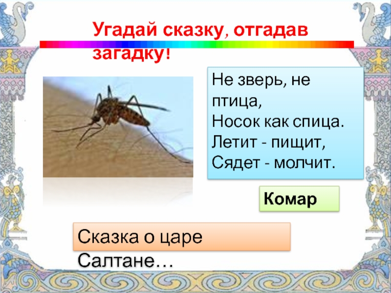 «Сказка о царе Салтане». Превратился комаром, мухой, шмелем.