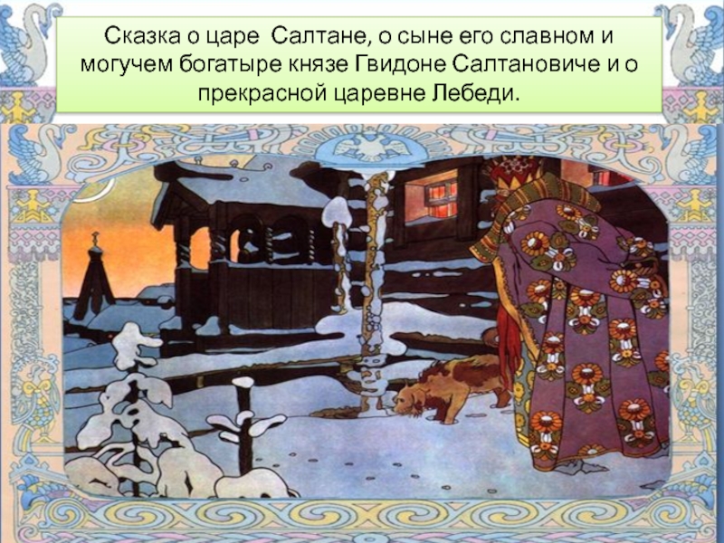 "Сказка о царе Салтане, о сыне его славном и могучем богатыре князе Гвидоне Салтановиче и о прекрасной царевне Лебеди".