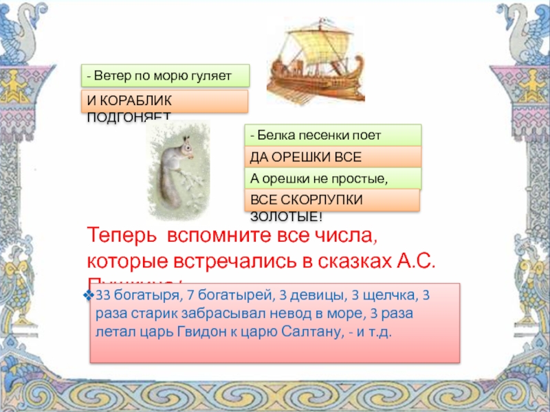 Теперь вспомните все числа, которые встречались в сказках А.С. Пушкина!