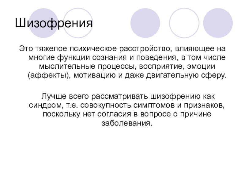 Лучше всего рассматривать шизофрению как синдром, т.е. совокупность симптомов и признаков, поскольку нет согласия в вопросе о причине заболевания.