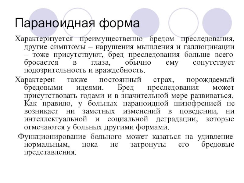 Характеризуется преимущественно бредом преследования, другие симптомы – нарушения мышления и