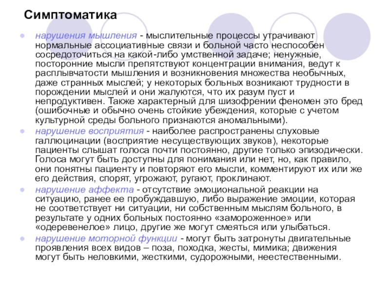 нарушения мышления - мыслительные процессы утрачивают нормальные ассоциативные связи и больной