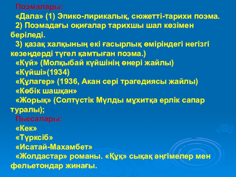 Поэмалары:«Дала» (1) Эпико-лирикалық, сюжетті-тарихи поэма. 2) Поэмадағы оқиғалар тарихшы шал көзімен беріледі. 3) қазақ халқының екі ғасырлық