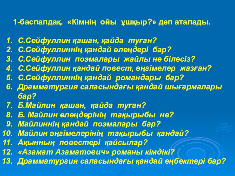 1-баспалдақ. «Кімнің ойы ұшқыр?» деп аталады.  С.Сейфуллин қашан, қайда туған?С.Сейфуллиннің қандай өлеңдері бар?С.Сейфуллин поэмалары жайлы