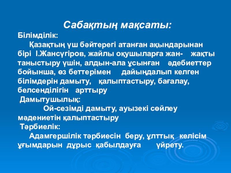 Сабақтың мақсаты:Білімділік: Қазақтың үш бәйтерегі атанған ақындарынан бірі І.Жансүгіров, жайлы оқушыларға жан- жақты таныстыру үшін, алдын-ала ұсынған әдебиеттер бойынша, өз беттерімен дайыңдалып келген білімдерін дамыту, қалыптастыру, бағалау, белсенділігін арттыру Дамытушылық: Ой-сезімді