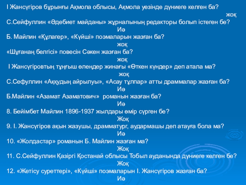 Слайд 10І Жансүгіров бұрынғы Ақмола облысы, Ақмола уезінде дүниеге келген ба?