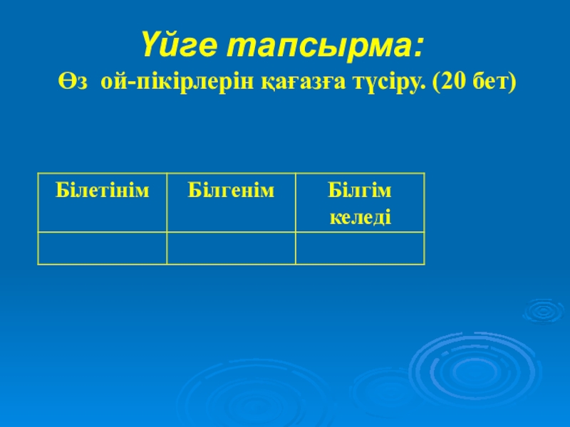 Үйге тапсырма: Өз ой-пікірлерін қағазға түсіру. (20 бет)