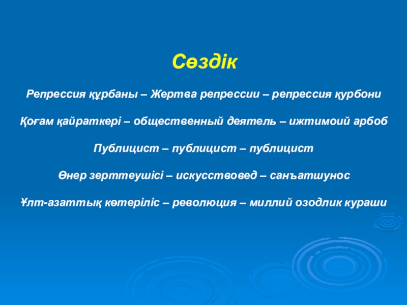 СөздікРепрессия құрбаны – Жертва репрессии – репрессия қурбониҚоғам қайраткері – общественный деятель – ижтимоий арбобПублицист – публицист