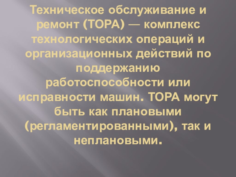 Слайд 2Техническое обслуживание и ремонт (ТОРА) — комплекс технологических операций и организационных