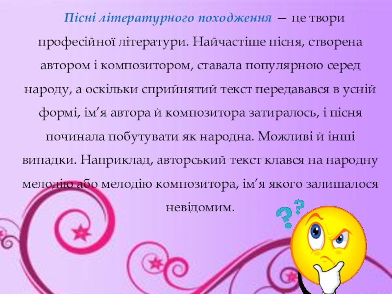 автором і композитором, ставала популярною серед народу, а оскільки сприйнятий текст передавався в усній формі, ім’я автора й композитора затиралось, і пісня починала побутувати як народна. Можливі й інші випадки. Наприклад, авторський текст клався на народну мелодію або мелодію композитора, ім’я якого залишалося невідомим.