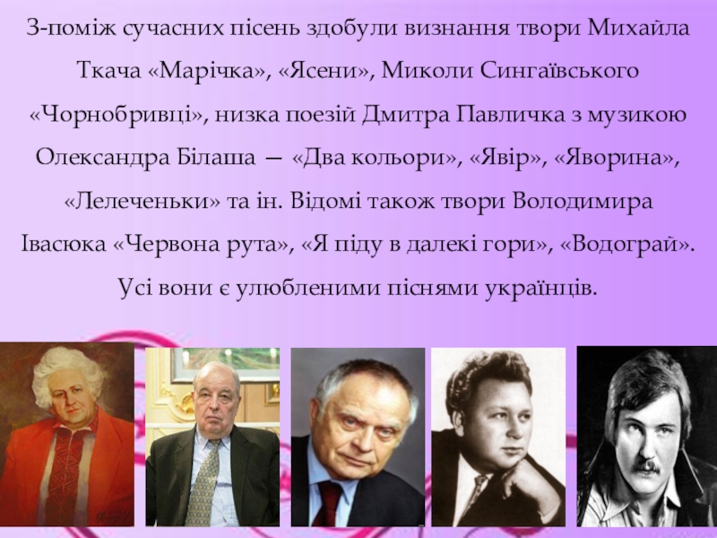 Сингаївського «Чорнобривці», низка поезій Дмитра Павличка з музикою Олександра Білаша — «Два кольори», «Явір», «Яворина», «Лелеченьки» та ін. Відомі також твори Володимира Івасюка «Червона рута», «Я піду в далекі гори», «Водограй». Усі вони є улюбленими піснями українців.