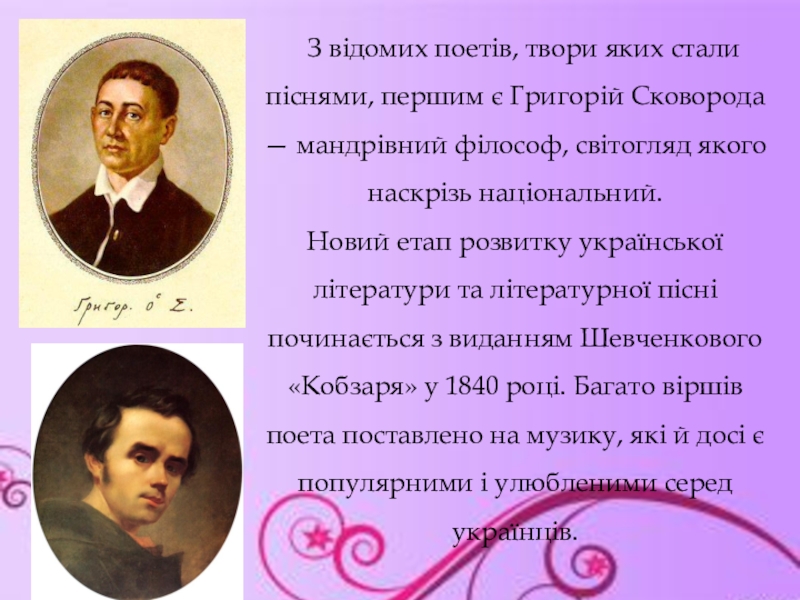 З відомих поетів, твори яких стали піснями, першим є Григорій Сковорода