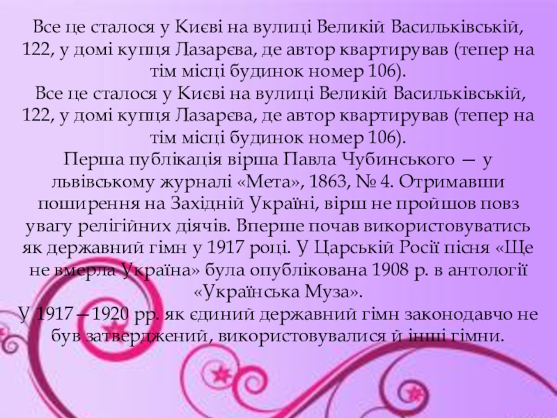 Коли Україна стала незалежною країною, то як національний гімн було взято пісню на слова П. Чубинського та музику композитора М. Вербицького. Первісний текст пісні перероблявся автором кілька разів, тому сучасний варіант відрізняється від нього.