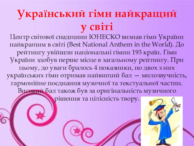 Центр світової спадщини ЮНЕСКО визнав гімн України найкращим в світі (Best National Anthem in the World). До рейтингу увійшли національні гімни 193 країн. Гімн України здобув перше місце в загальному рейтингу. При цьому, до уваги бралось 4 показники, по двох з них українських гімн отримав найвищий бал — милозвучність, гармонійне поєднання музичної та текстуальної частин. Високий бал також був за оригінальність музичного рішення та цілісність твору.