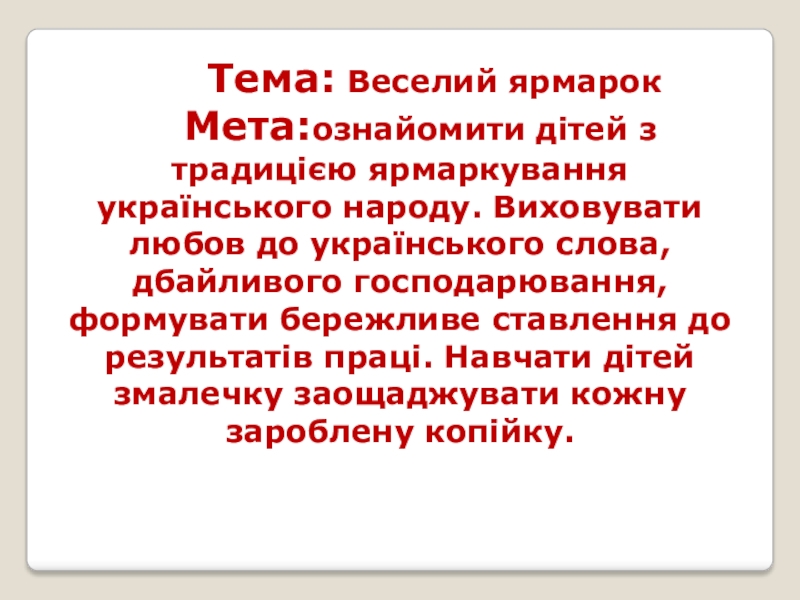 народу. Виховувати любов до українського слова, дбайливого господарювання, формувати бережливе ставлення до результатів праці. Навчати дітей змалечку заощаджувати кожну зароблену копійку.