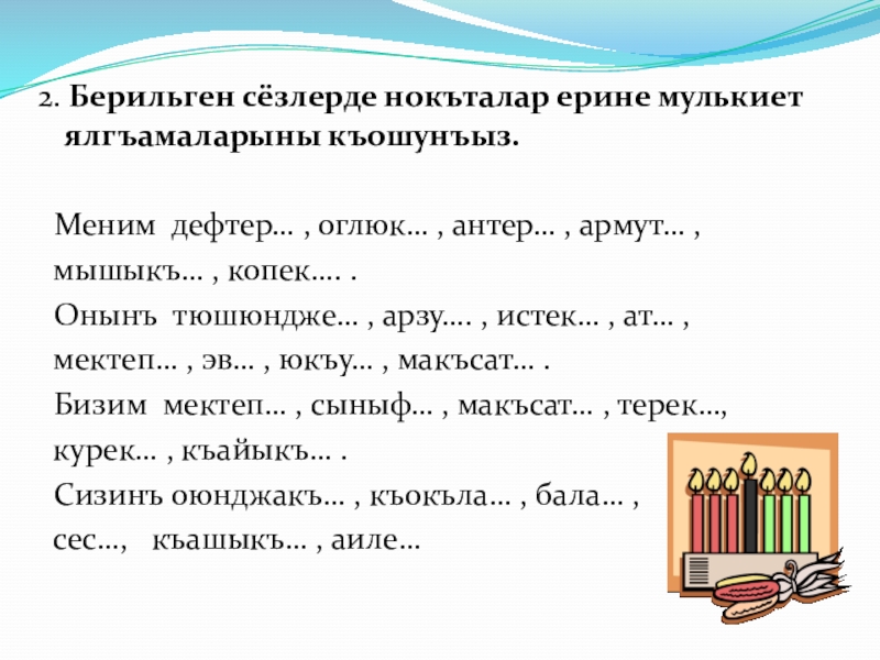 2. Берильген сёзлерде нокъталар ерине мулькиет ялгъамаларыны къошунъыз.